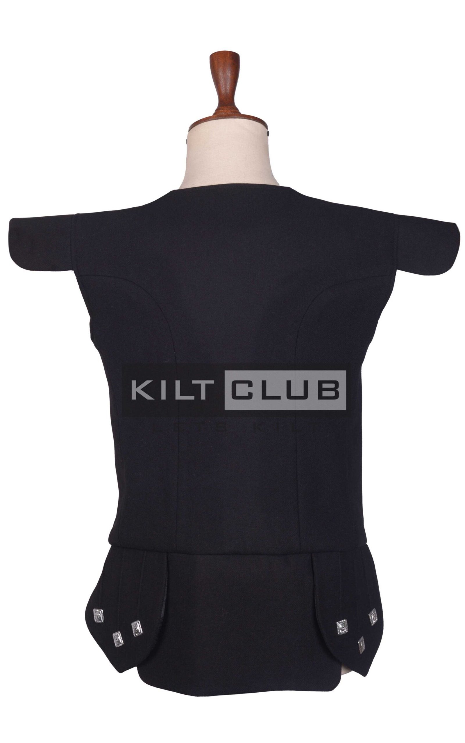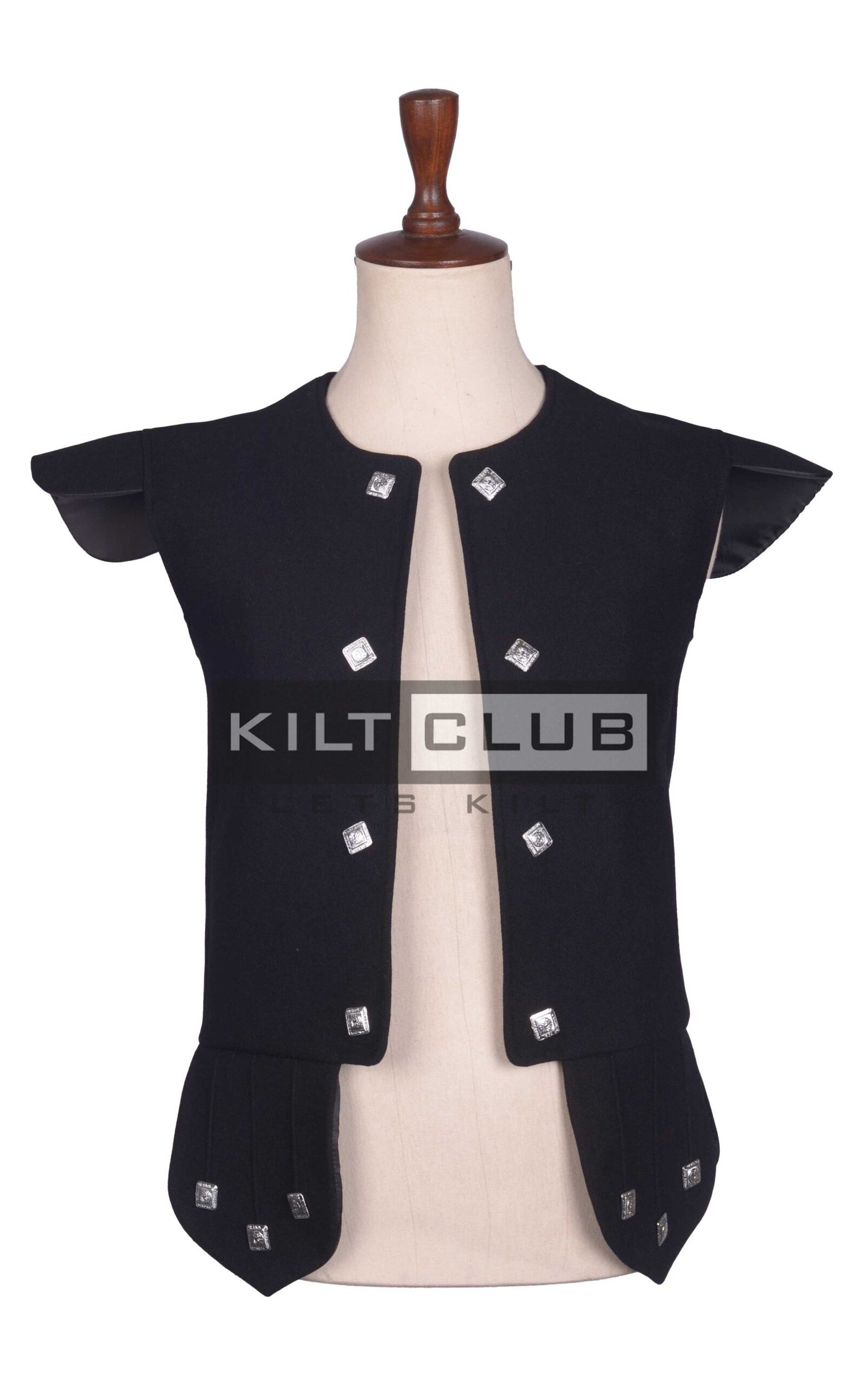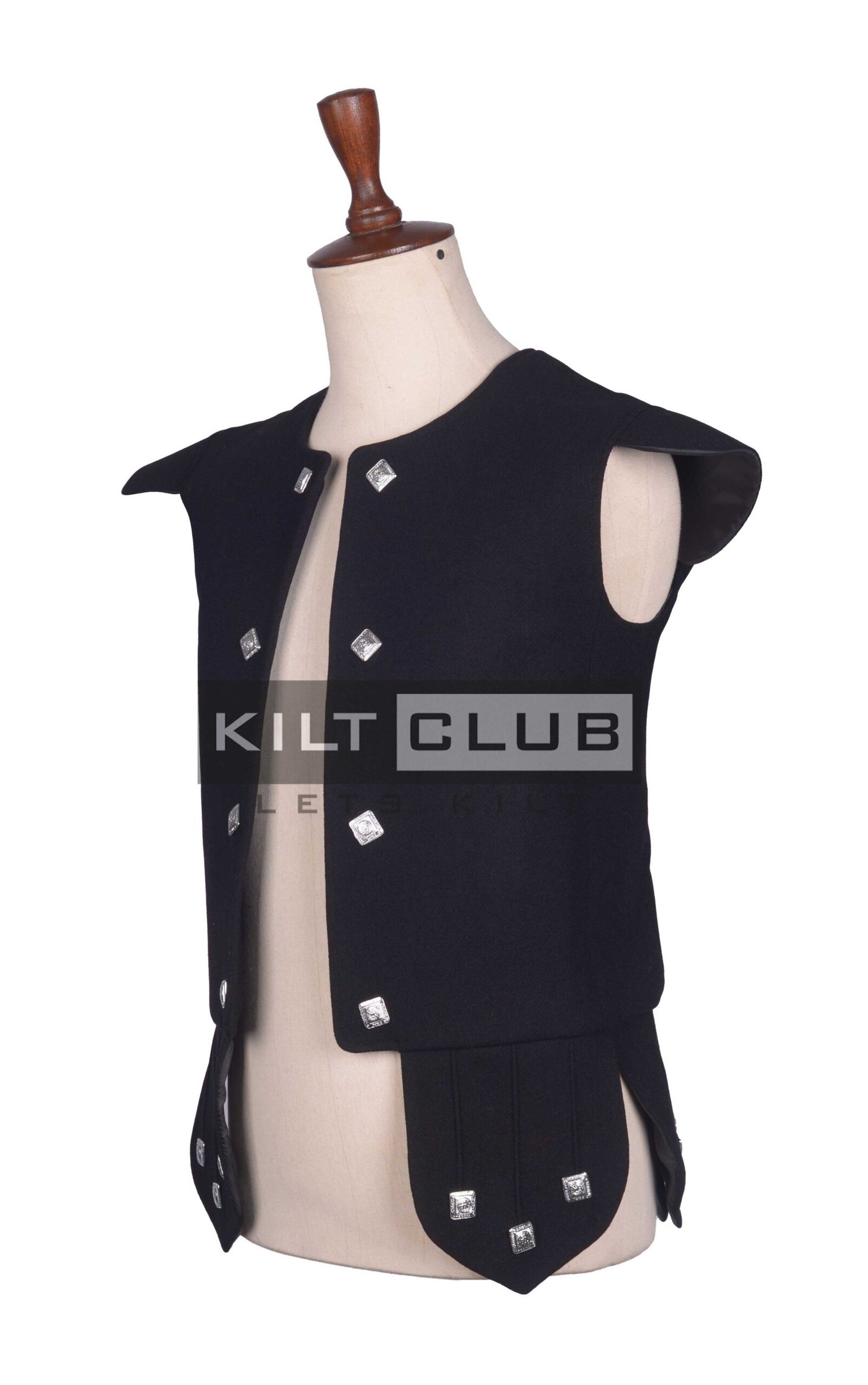 We designed this waistcoat with a nod to Scottish nobility. The high-neck collar and structured front create a regal silhouette, while silver-tone buttons and subtle piping add a touch of ceremonial flair. The deep black color brings a modern, versatile edge to this historic style, making it perfect for both formal events and statement daily wear.