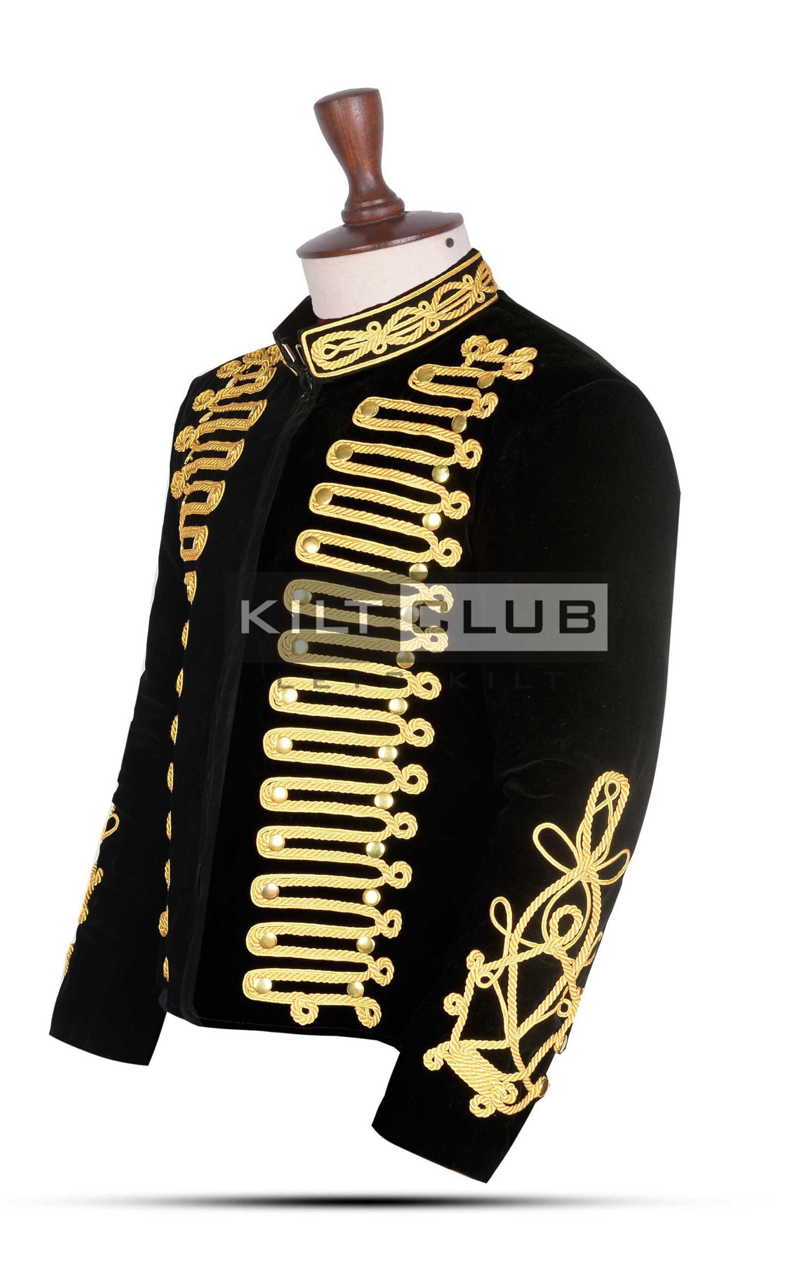 Crafted from premium black velvet, the jacket offers a rich, smooth texture that exudes luxury. Ornate gold braiding decorates the front, cuffs, and shoulders, adding depth, contrast, and authentic military flair. The gold accents are carefully stitched to enhance the sharp structure and give the jacket a polished, formal look.
