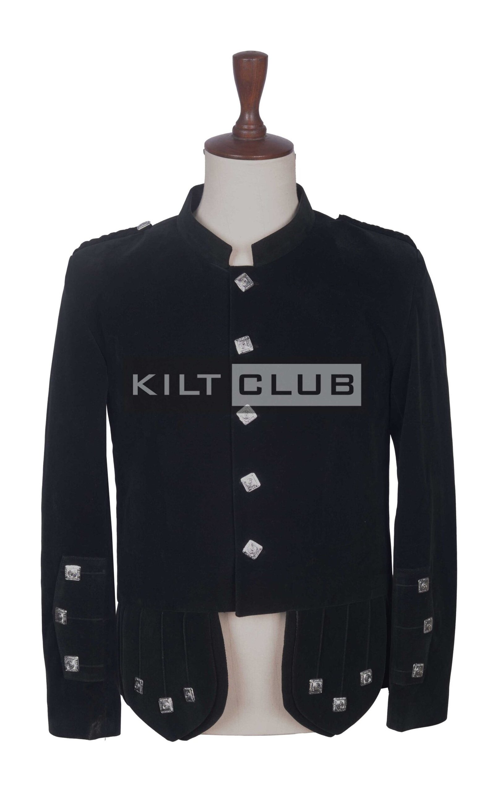 Made from rich black velvet, the Kenmore doublet offers a smooth, luxurious finish with a subtle sheen. Its traditional design features a buttoned front with high-cut square edges, allowing your sporran and kilt to take center stage. The silver-toned Celtic buttons on the front, cuffs, and tails add a touch of ceremonial grandeur.
