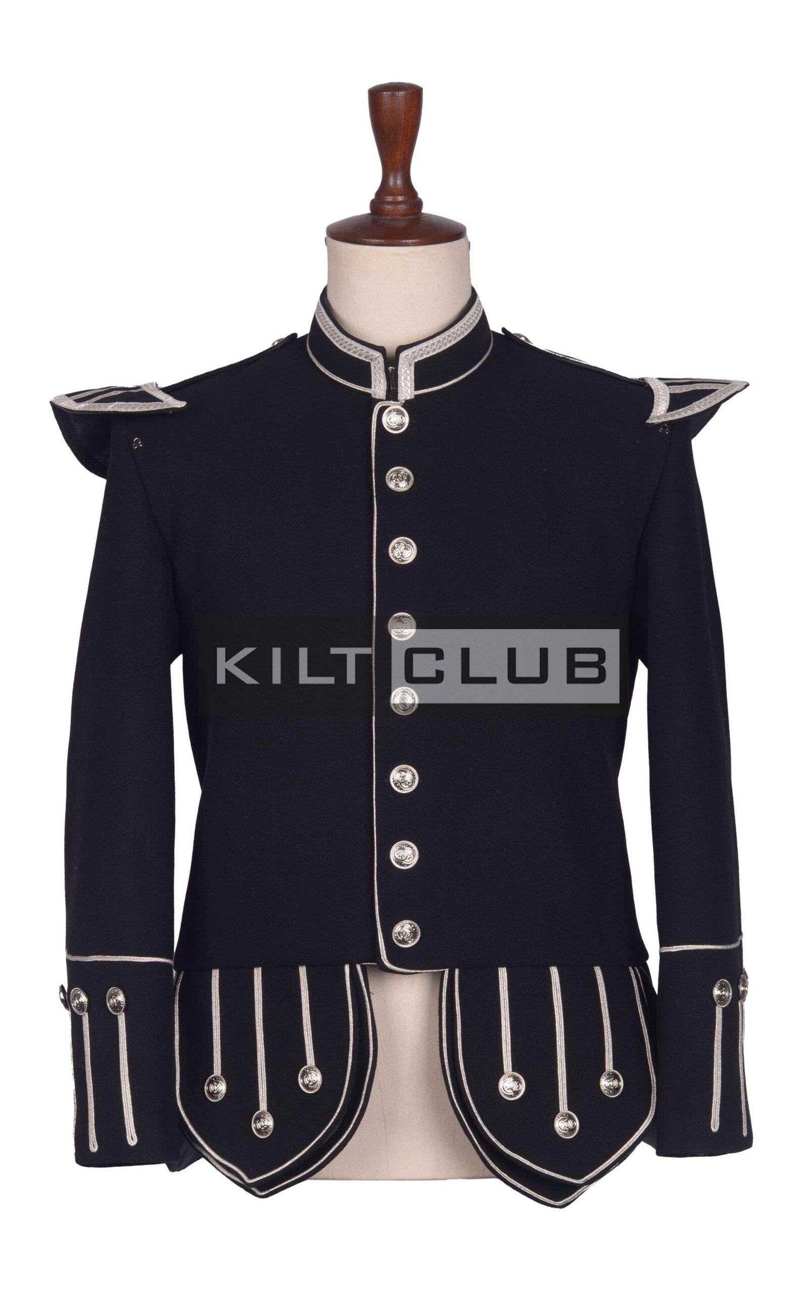 Stand out in formal Highland dress with the Black Wool Silver Braided Scottish Military Piper Doublet, a distinguished jacket crafted for pipers, drummers, and ceremonial leaders. Designed to reflect Scotland’s proud military heritage, this doublet blends traditional elegance with modern craftsmanship for a striking and authentic look.