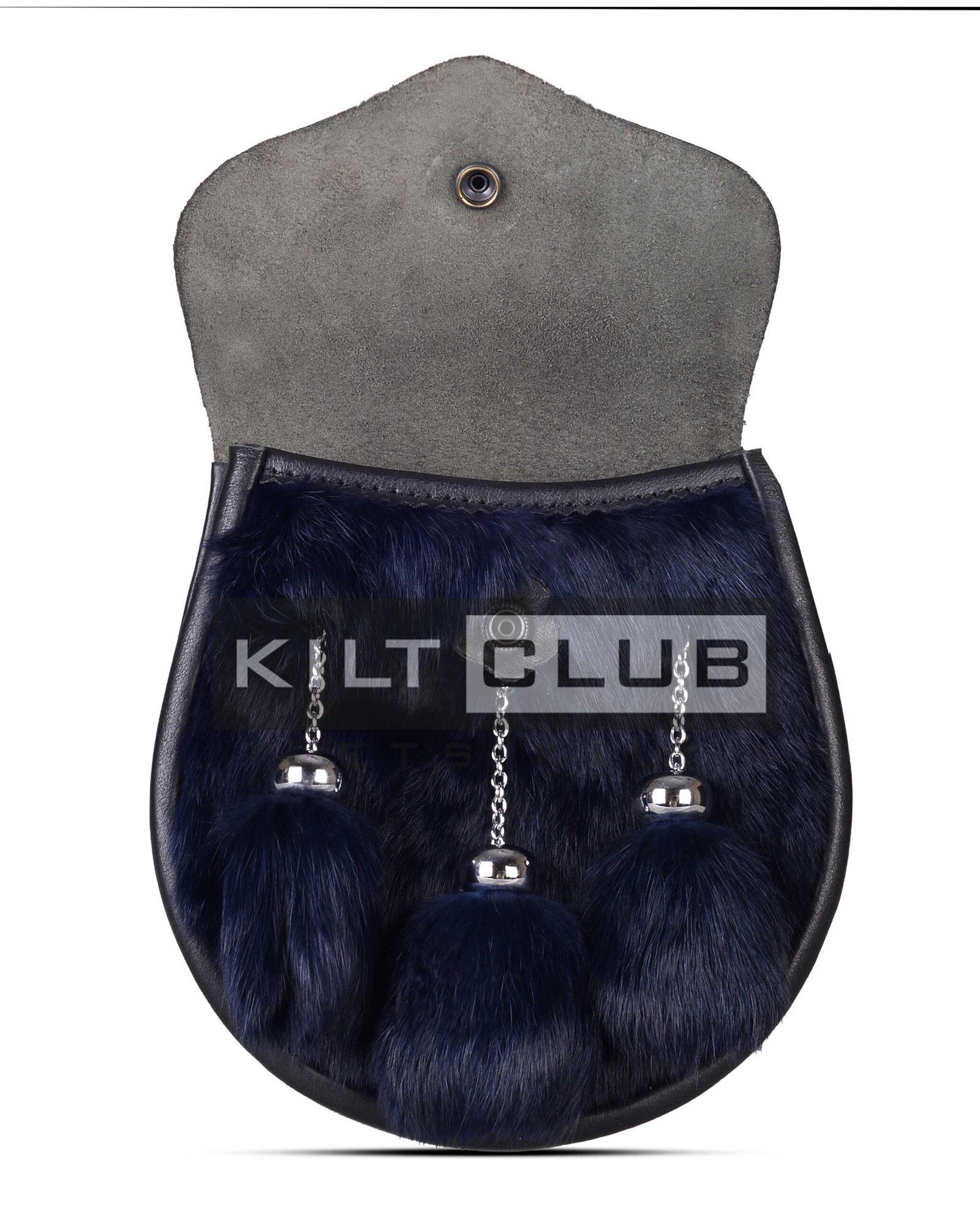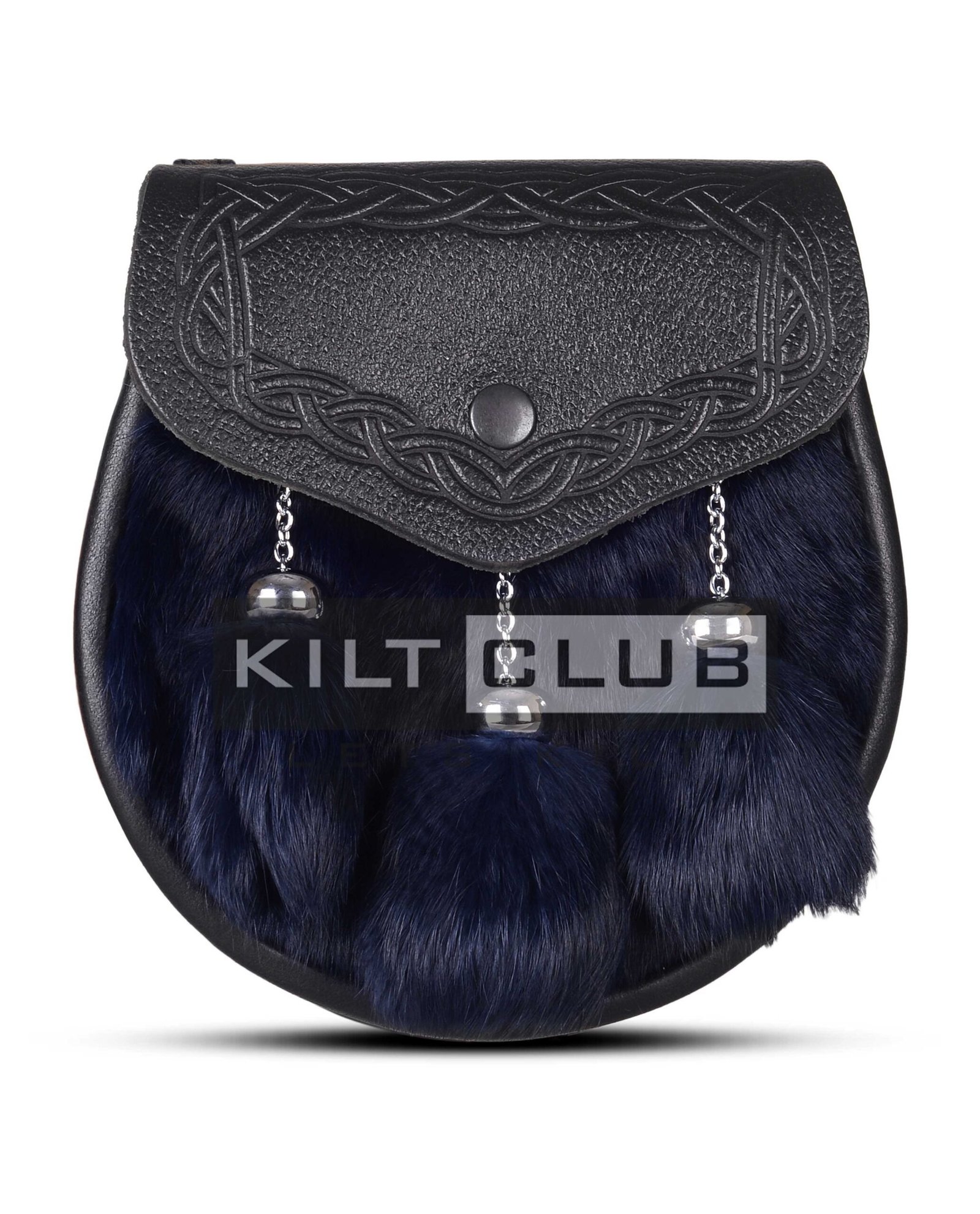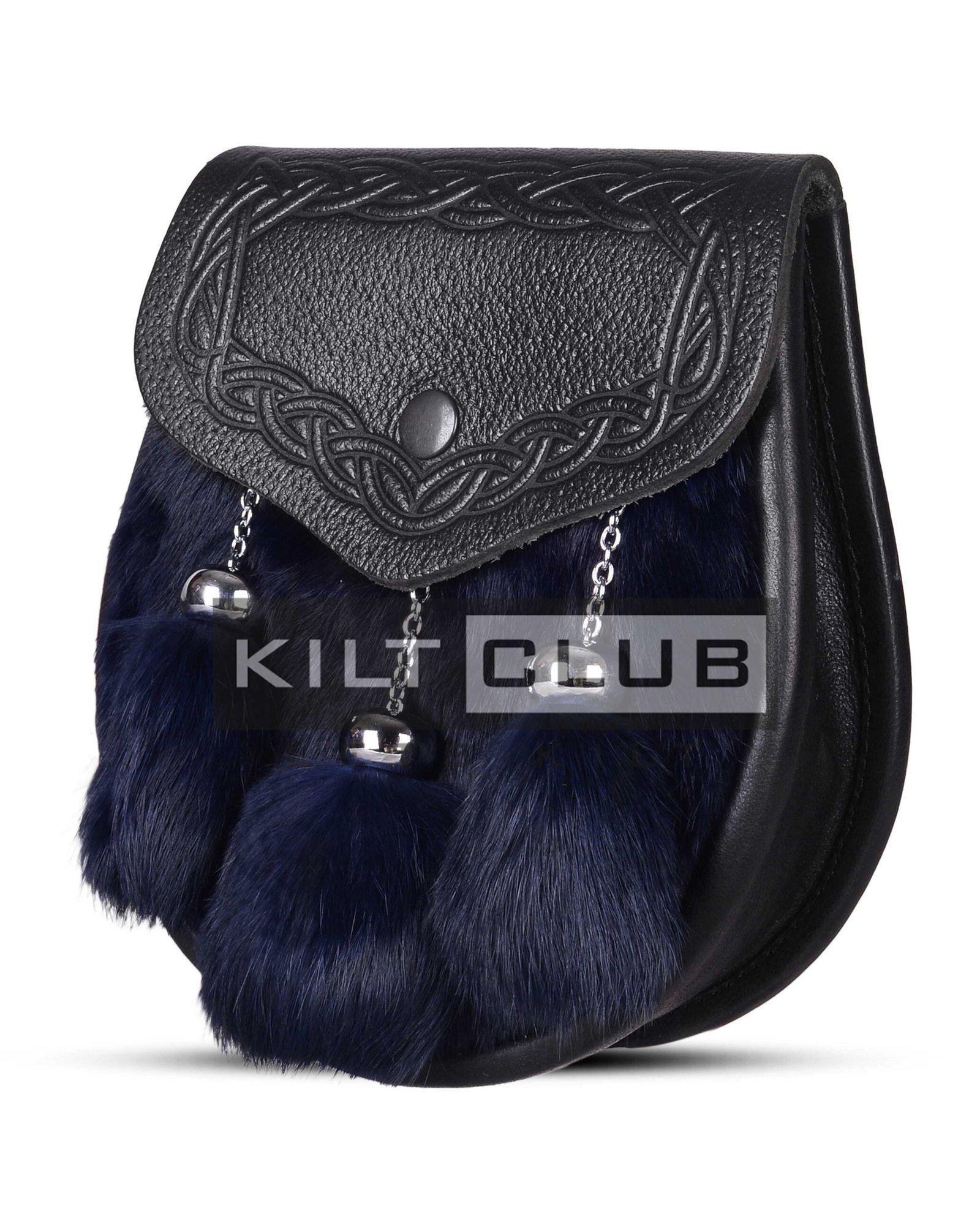 We handcraft this semi-dress sporran using premium-quality leather and luxuriously soft blue-dyed rabbit fur. The striking blue fur front panel adds vibrant personality, while the smooth black leather body ensures long-lasting durability. Three matching fur tassels hang from polished chrome chains, giving the sporran a touch of movement and shine.