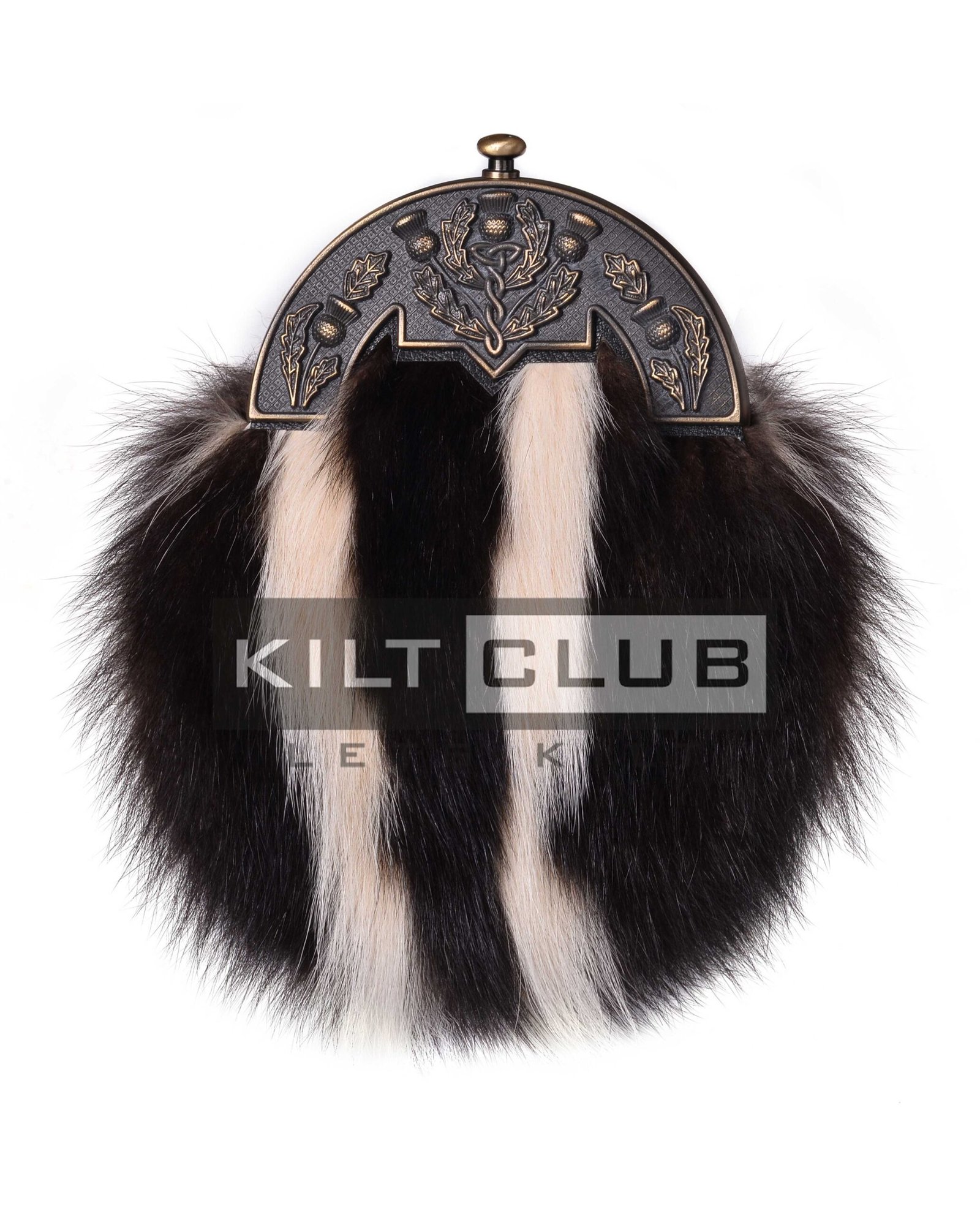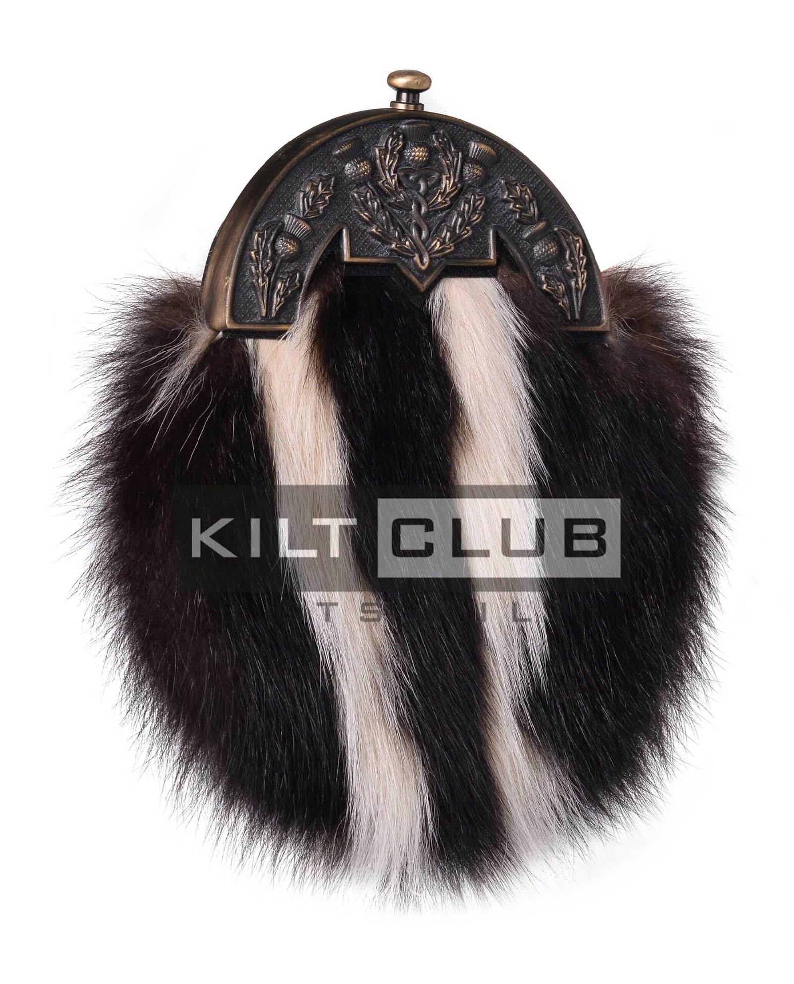 Crafted from high-quality skunk fur, the sporran stands out with its striking black-and-white pattern. The soft yet durable texture of the fur complements the brass thistle emblem on the flap. This emblem symbolizes strength and Scottish pride, making the sporran a meaningful addition to your attire.