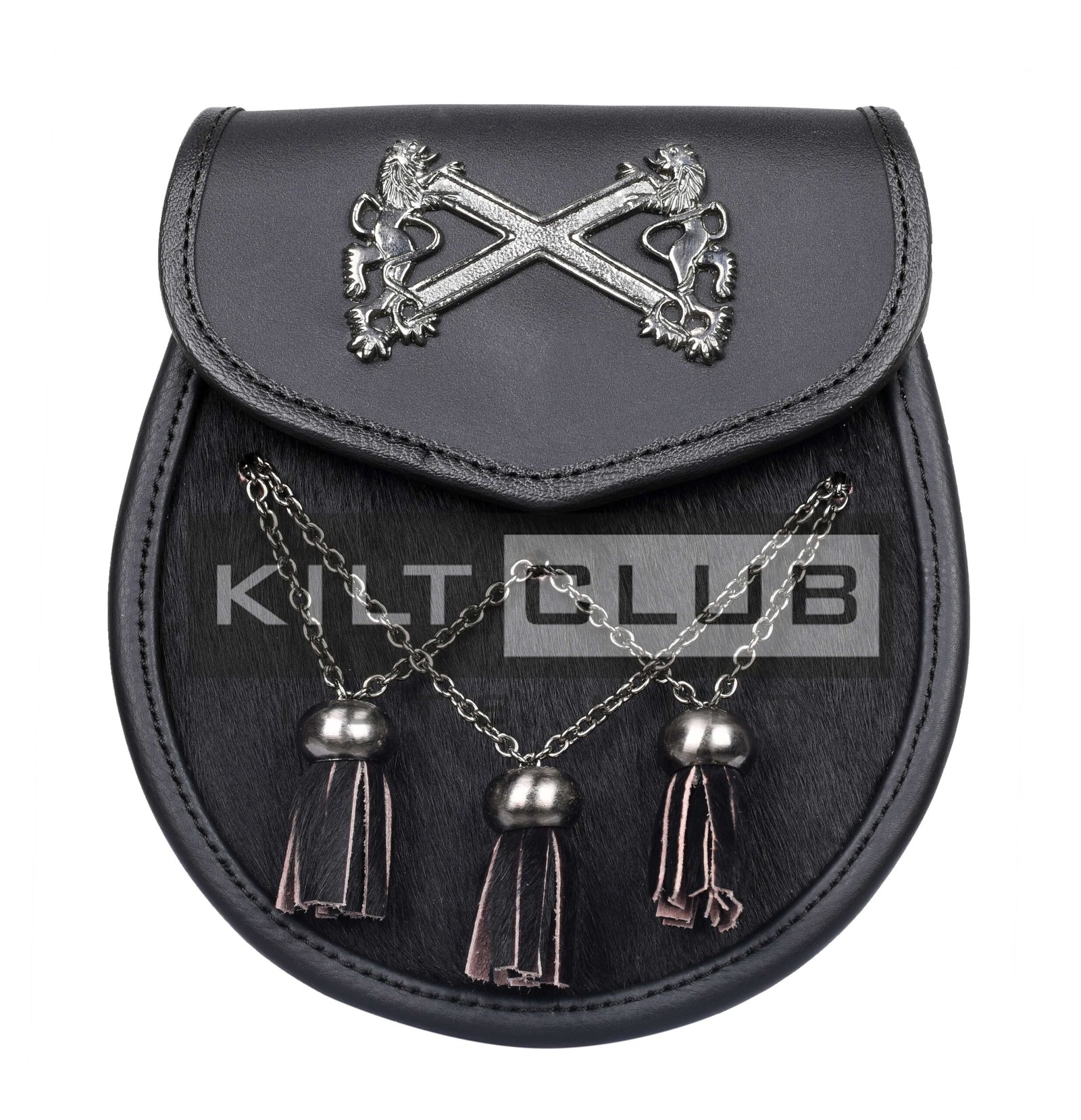 The sleek black leather pairs effortlessly with a wide range of tartans, while the semi-dress style transitions smoothly from daytime events to evening functions. Whether you are dressing for a formal ceremony, Highland games, or a special celebration, the Cross Rampant Lion Emblem Black Leather V Cross Semi Dress Sporran adds authority, elegance, and authentic Scottish character to your outfit.
