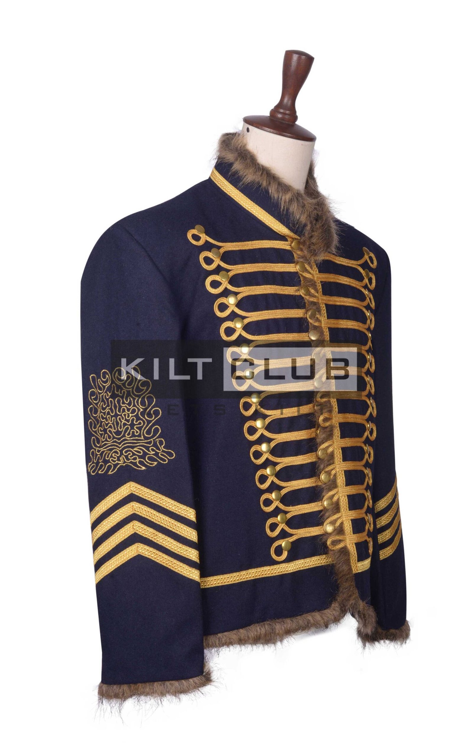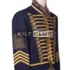 Crafted from premium navy wool, the jacket delivers both warmth and a refined structure. Intricate gold braiding across the chest, cuffs, and collar pays homage to classic hussar regalia, while the double row of gold-toned buttons adds a powerful, polished finish. Each element is designed to echo the dignity and flair of historical military style.