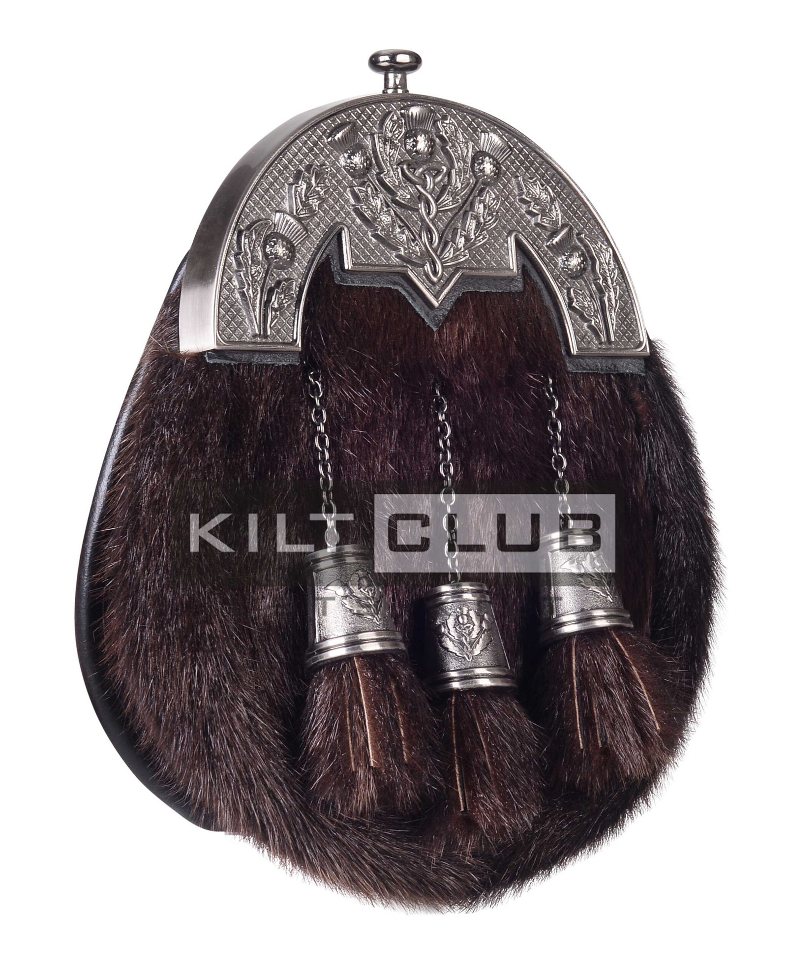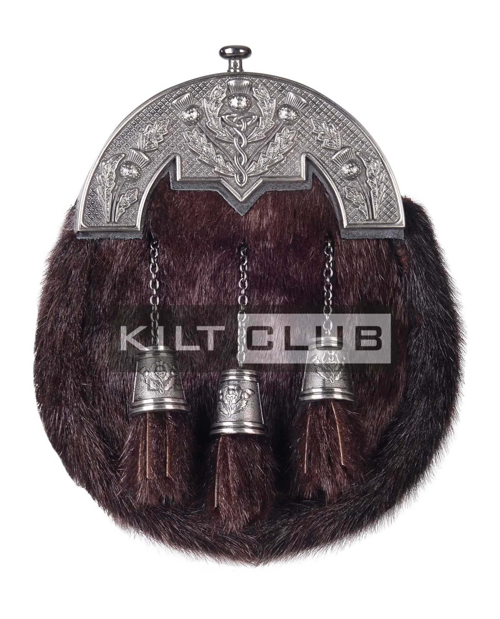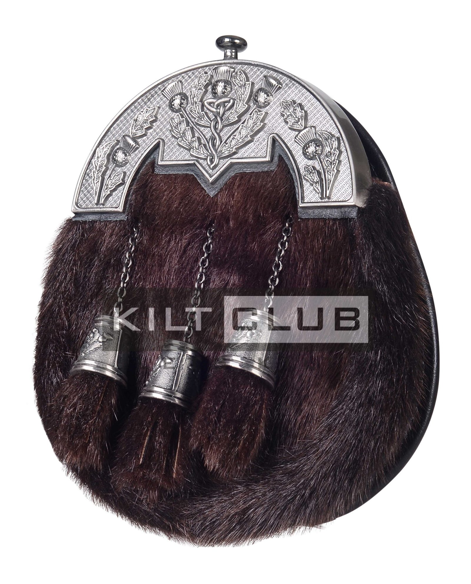 Made from genuine brown rabbit fur, this sporran offers a soft texture and rich, earthy tones that elevate your ensemble. The natural variation in the fur creates visual depth, giving it a timeless and distinguished look. The top features a Nickle Brushed Thistle Brown Seal Fur Full Dress Sporran, beautifully detailed with Scotland’s national emblem—the thistle. The brushed nickel finish adds a modern contrast to the fur, combining heritage with contemporary styling.