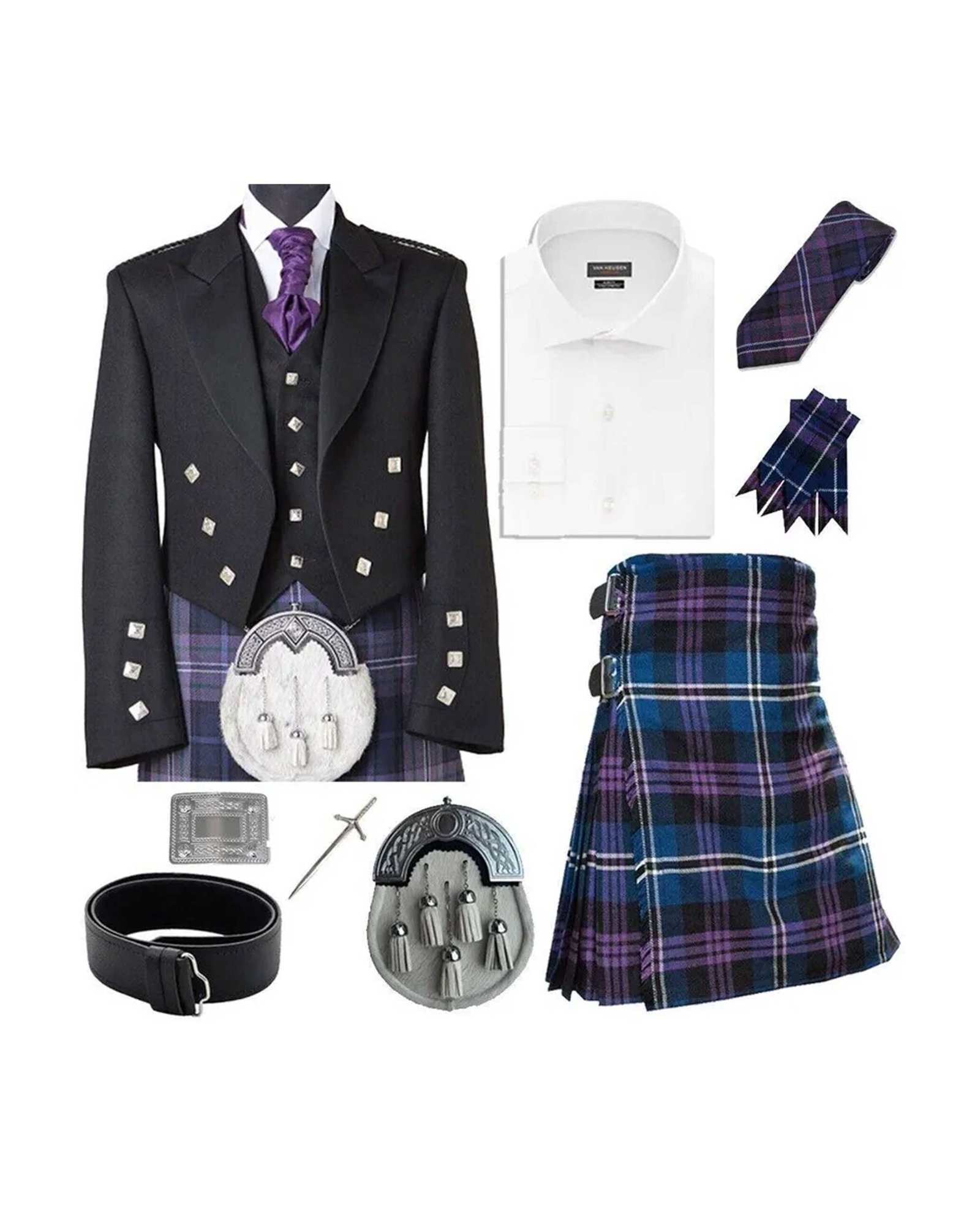 Complementing the jacket is a traditional 8-yard kilt, handcrafted from 100% worsted wool in your choice of authentic Scottish tartans. Pleated to the sett for a striking visual flow, the kilt showcases both your heritage and style with confidence. To complete the look, this ensemble includes essential accessories: a full-dress fur sporran with an ornate metal cantle, an adjustable leather kilt belt with a detailed Celtic buckle, and matching tartan flashes with a classic kilt pin. Ghillie brogues and kilt hose add a traditional finishing touch, while your choice of cravat or ruche tie provides the ideal formal accent. Each component is chosen for both quality and authenticity, ensuring a cohesive outfit that’s ready to wear for any occasion. Whether you’re walking down the aisle or attending a Highland gathering, the Prince Charlie Traditional 8 Yard Kilt Outfit offers sophistication, comfort, and unmistakable Scottish pride—all in one timeless package.