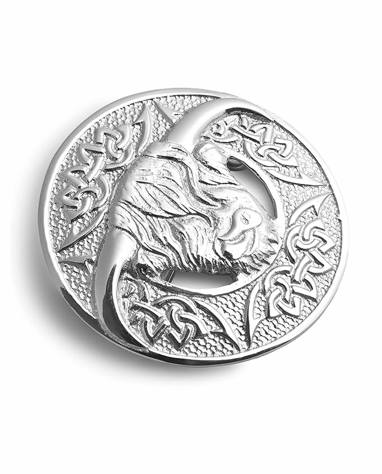 The brooch features a detailed Highland cow head, complete with lifelike horns and textured fur, representing the hardy and noble nature of this legendary breed. The chrome finish adds a sleek, polished look that offers a modern twist on a traditional Scottish symbol, making it an eye-catching accessory for any occasion.