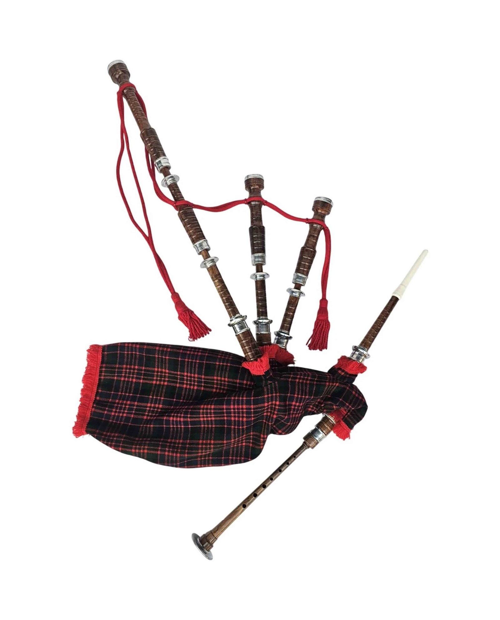 The MacDonald Tartan bag cover adds a distinct touch, combining bold red, green, and blue hues to represent the famous Clan MacDonald. The tartan design complements the polished wood finish, giving this bagpipe a classic and elegant look. Whether you’re a seasoned piper or a beginner, this combination of sound and style is sure to turn heads.