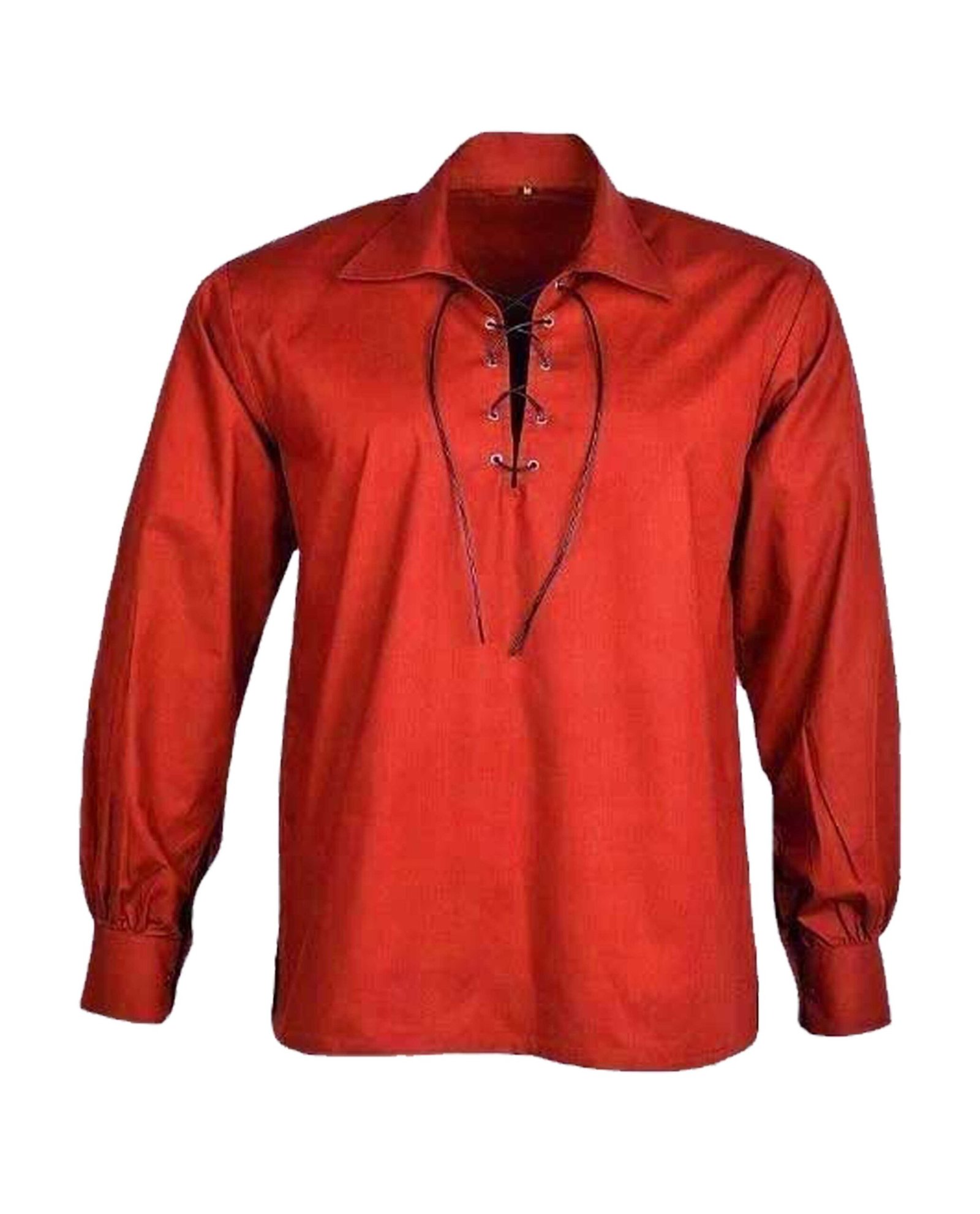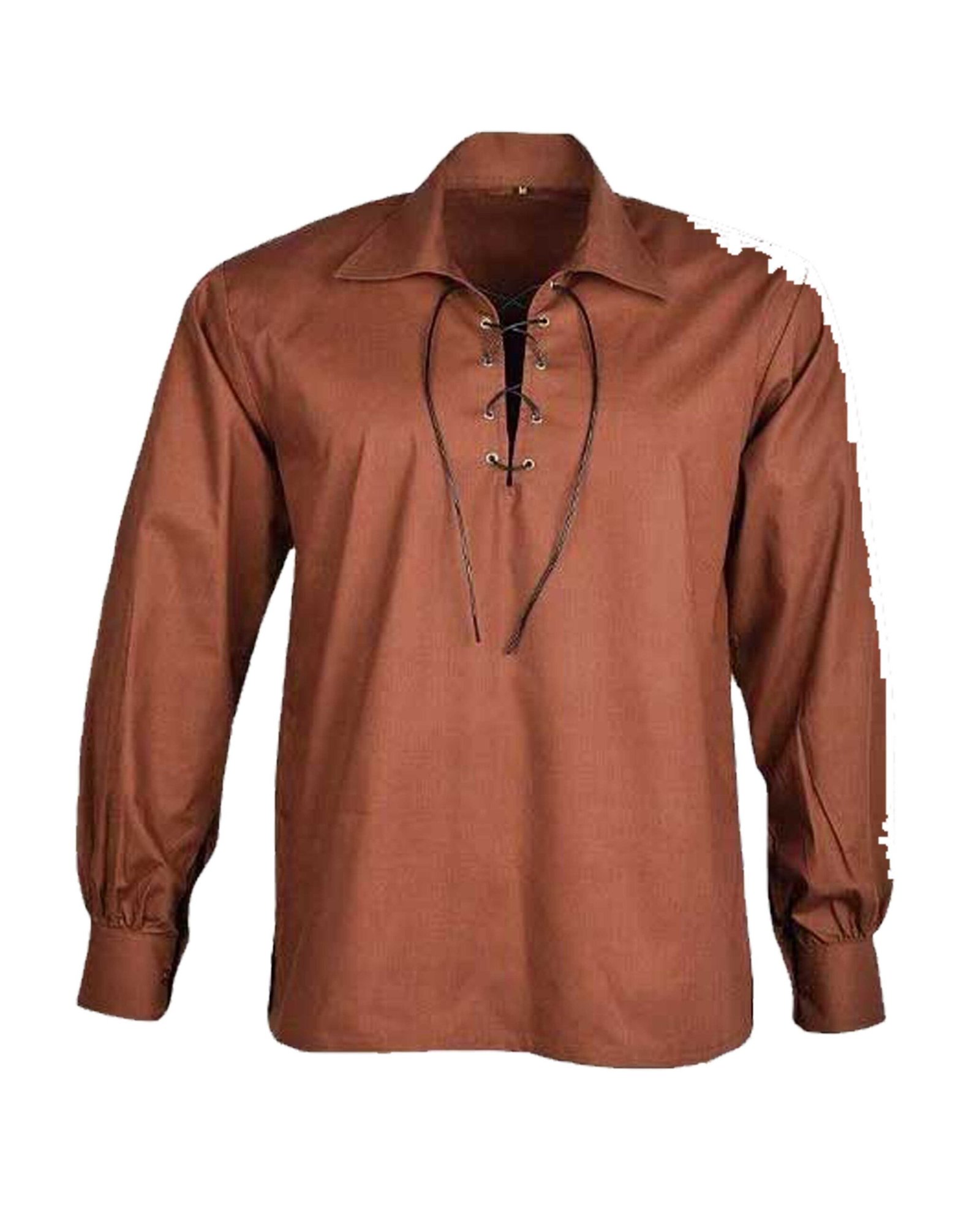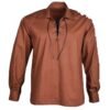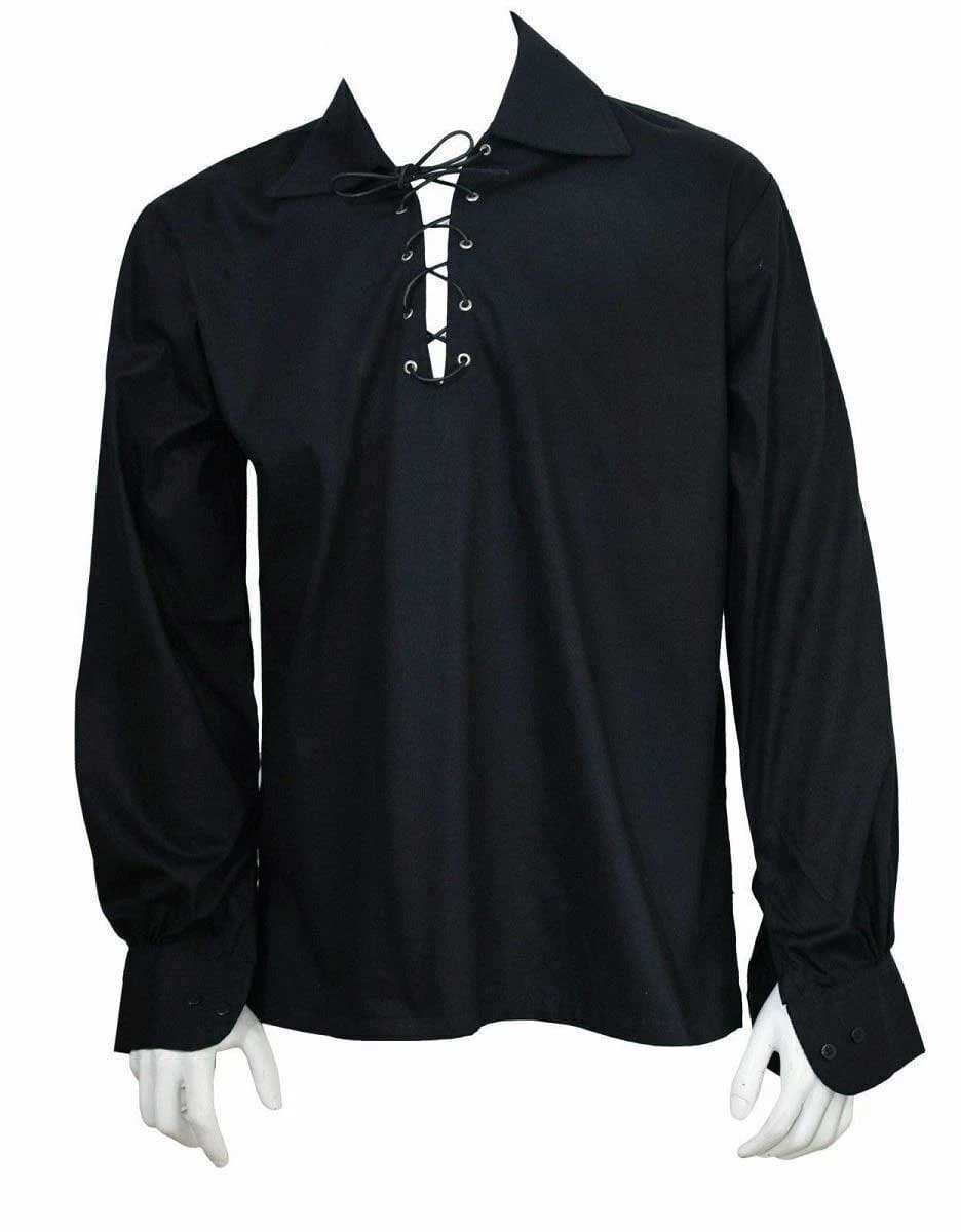 The shirt’s defining feature is its Ghillie-style lace-up neckline, complete with sturdy metal eyelets and durable cord ties. You can wear it loosely for a rugged, informal look or lace it tightly for a more structured appearance. Reinforced seams and gathered cuffs add durability while enhancing the period-inspired style.