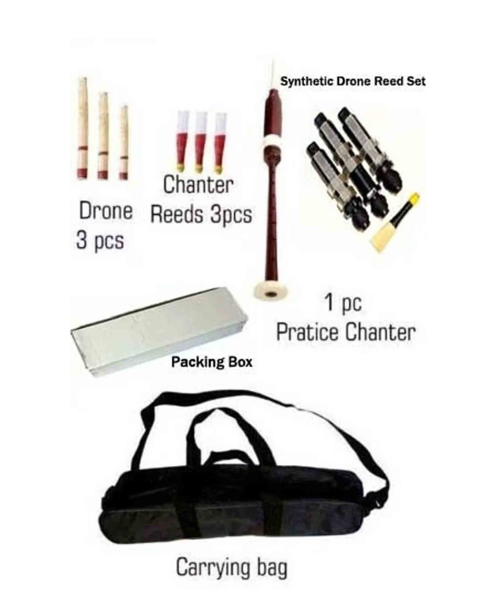 The set includes three drones (two tenor and one bass), a precisely bored chanter for accurate pitch, and a blowpipe fitted with a non-return valve for smooth and consistent airflow. A robust airtight synthetic bag provides stable pressure, allowing for effortless control and long playing sessions. The bag is covered in a traditional tartan pattern, bringing authentic Scottish flair to your performance.