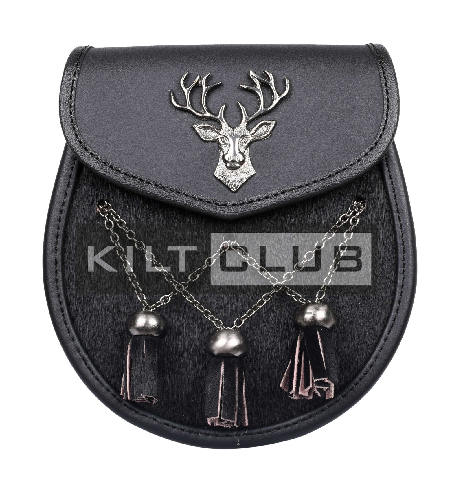 The front flap showcases a beautifully detailed stag head emblem, a timeless Celtic symbol representing strength, leadership, and connection to the Highlands. Expert embossing highlights the intricate antler design, creating a bold centerpiece that enhances the overall elegance of your kilt ensemble. The deep black leather finish provides a classic look that pairs seamlessly with a wide range of tartans and Highland dress accessories.