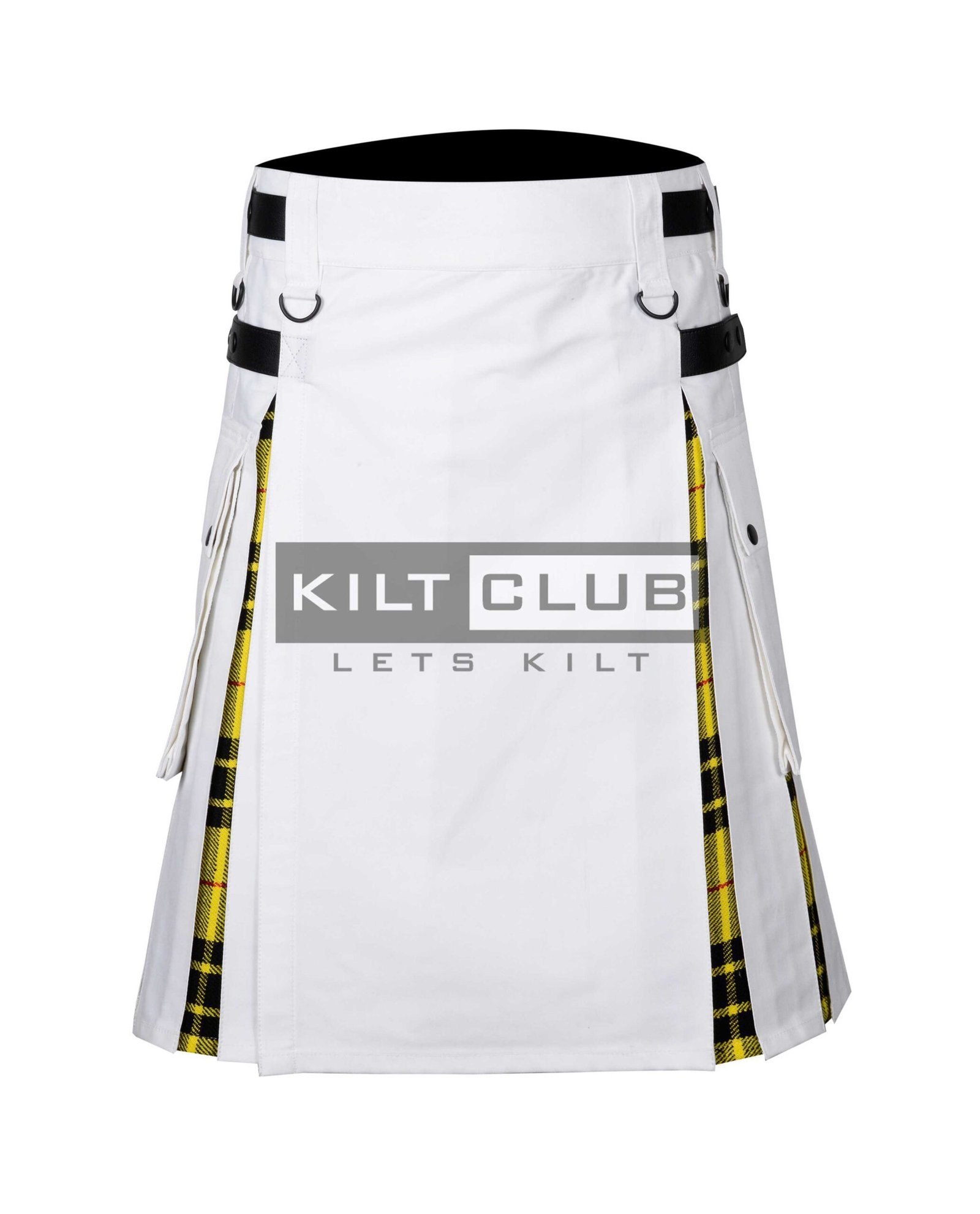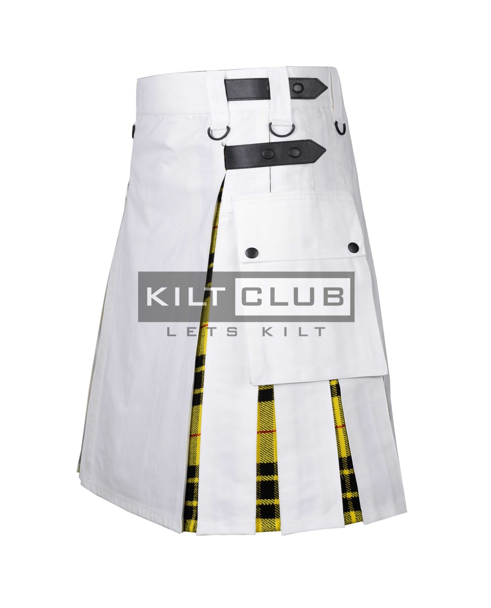 Make a bold and unforgettable statement with the White Cotton – MacLeod of Lewis Tartan Hybrid Kilt. This modern hybrid kilt blends the crisp elegance of white cotton with the iconic, high-contrast MacLeod of Lewis tartan, known for its striking yellow and black pattern. Designed for those who value tradition and individuality, this kilt is ideal for festivals, ceremonies, Highland games, or casual wear with a cultural edge.